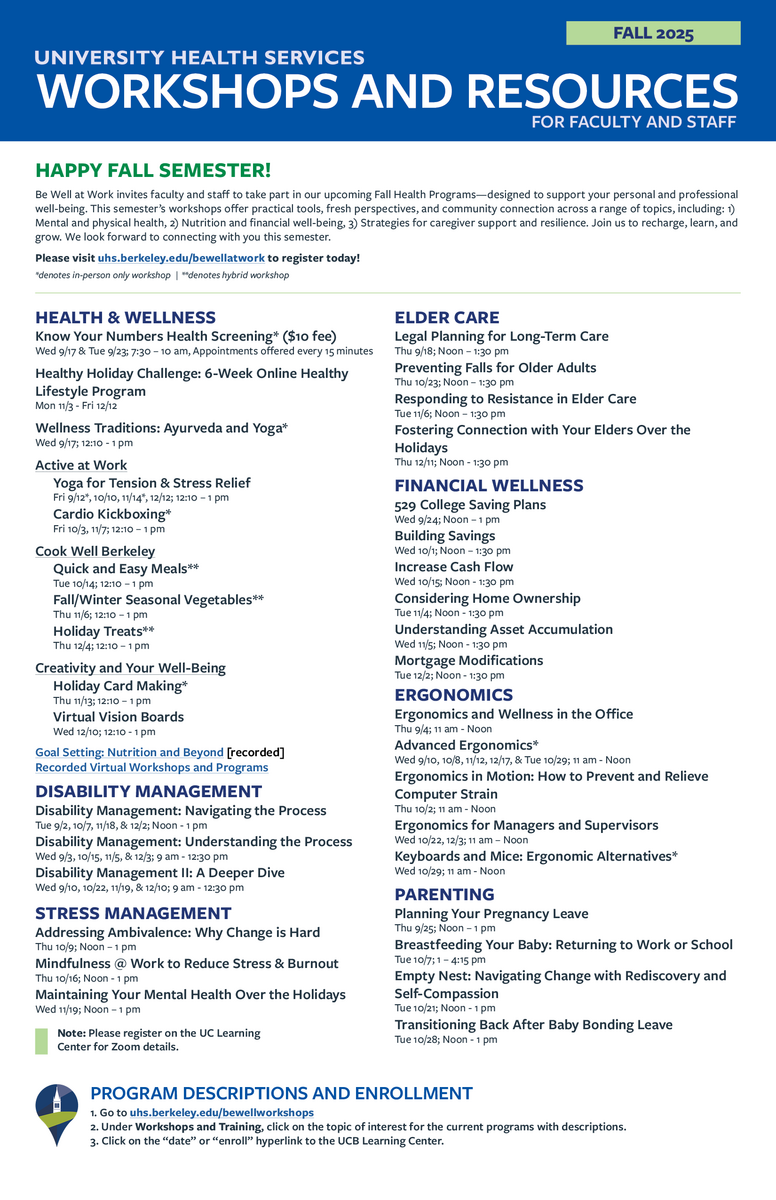 - To contact the Wellness Team, please email Wellnessfacstaff@berkeley.edu.